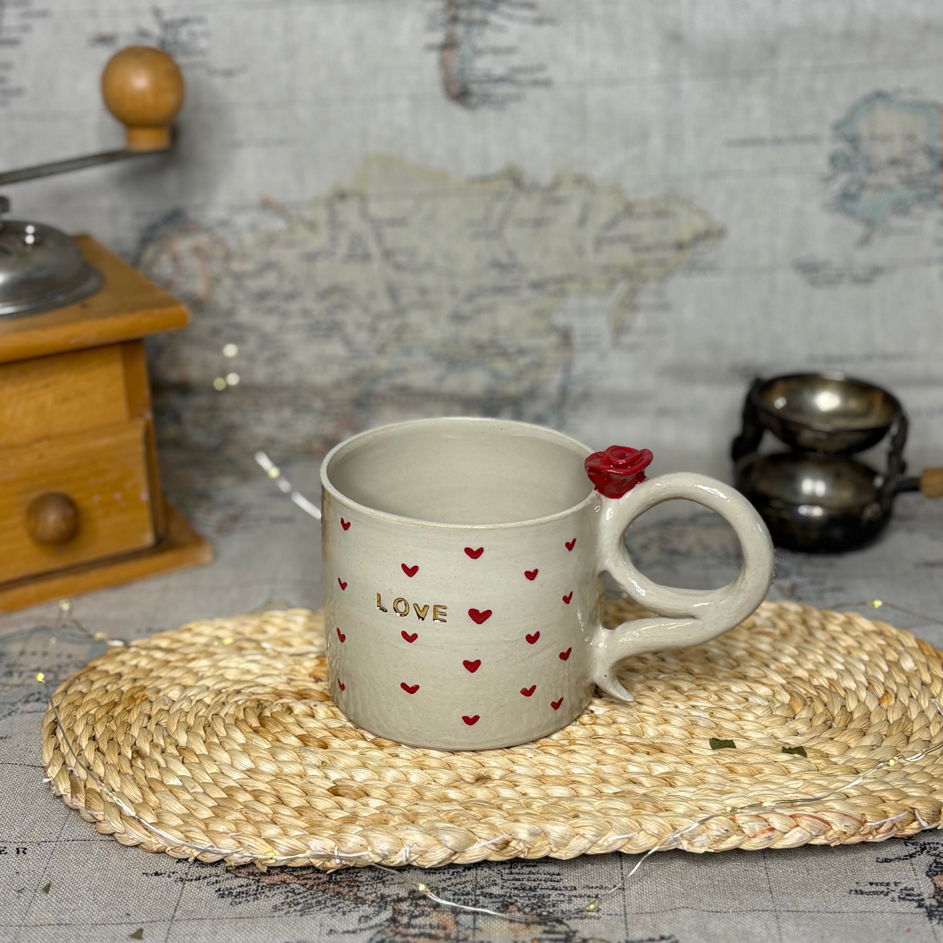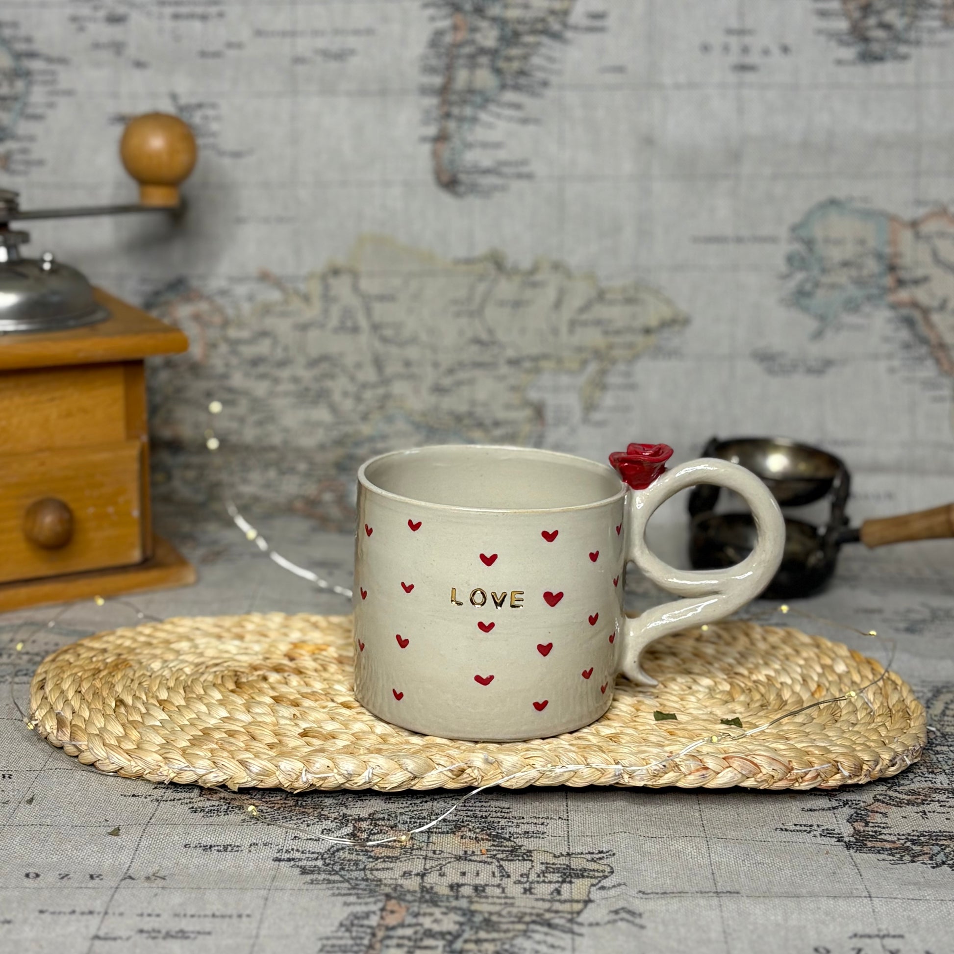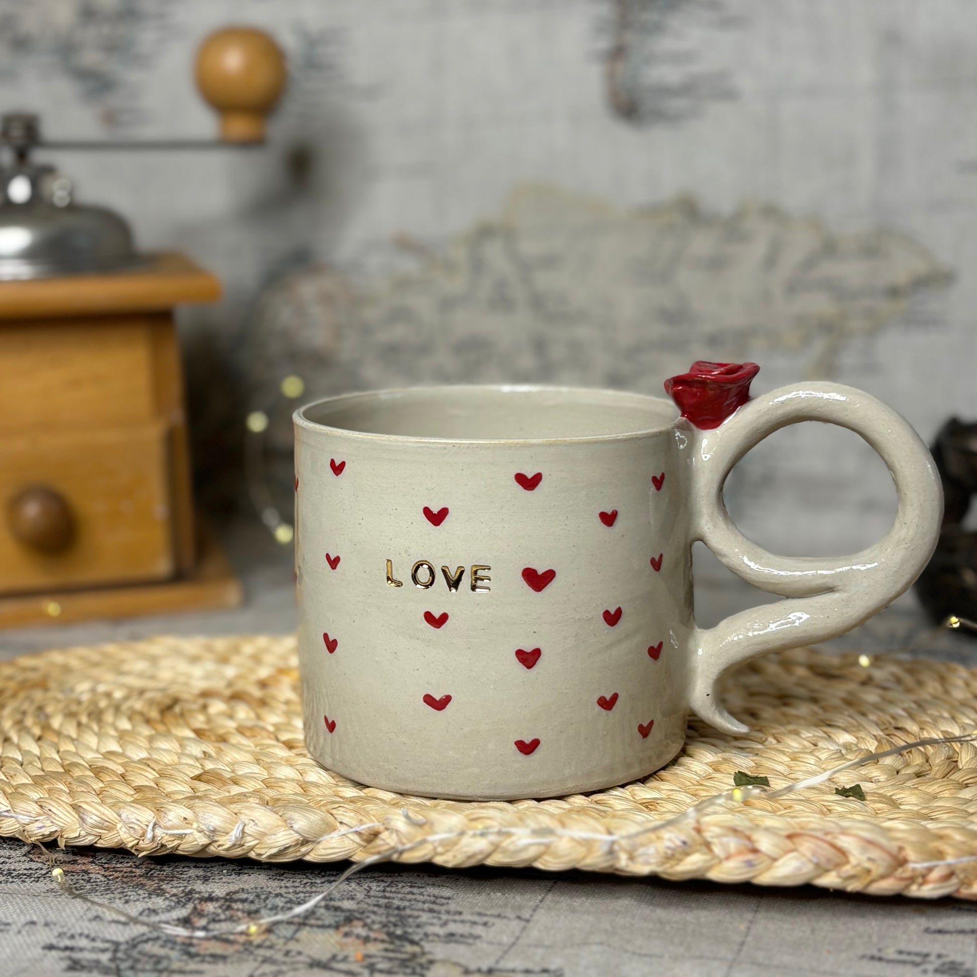 Son décor de petits cœurs rouges et son inscription délicatement dorée apportent une touche chaleureuse. L’anse, ornée d’un détail sculpté, complète l’ensemble avec douceur. Chaque exemplaire est unique, marqué par les gestes de l’artisan et de subtiles variations.
