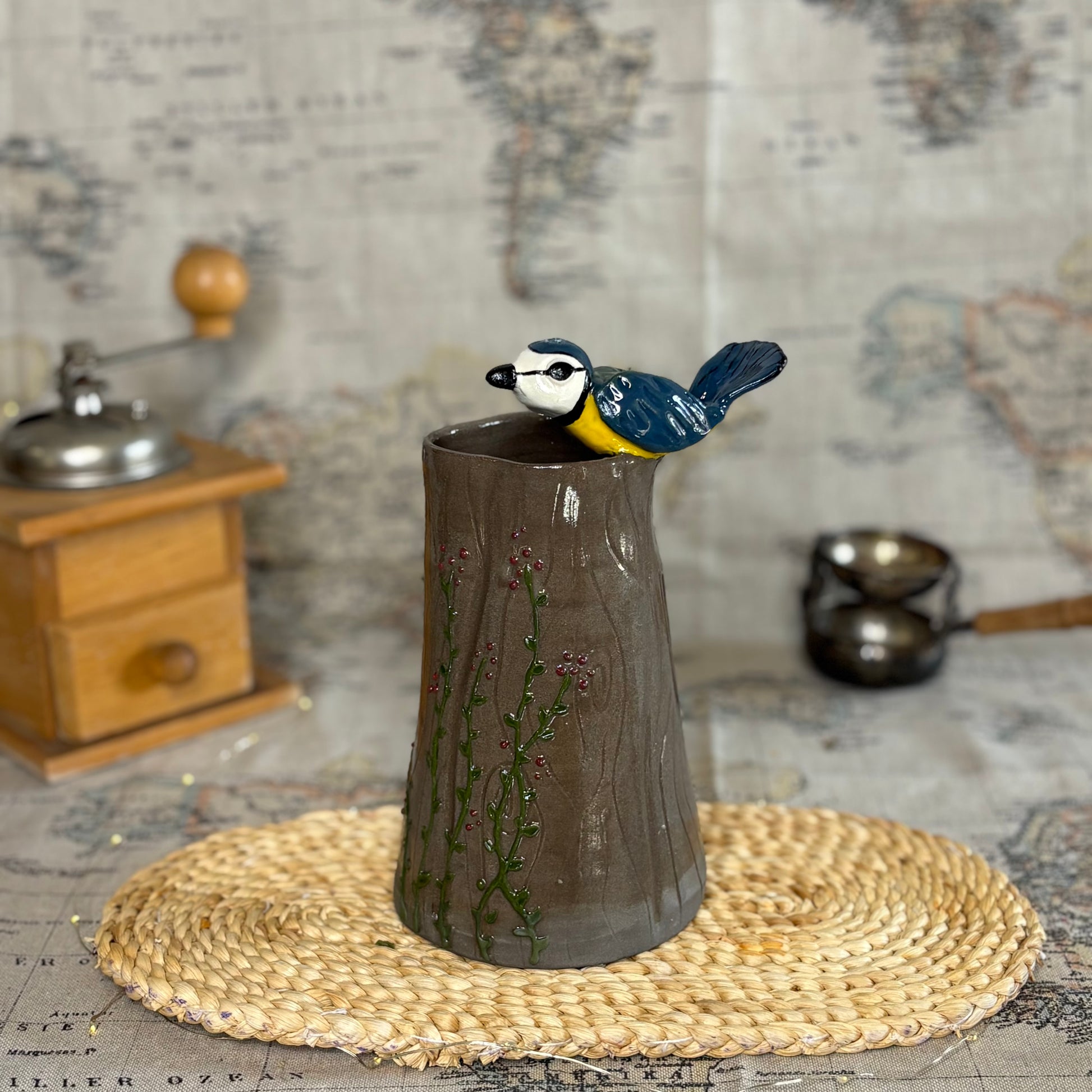 Et puis, sur la lèvre du vase, un petit oiseau s’est posé. Il vient adoucir la structure et raconter une histoire : celle d’un instant suspendu, d’un matin calme en forêt. ✨